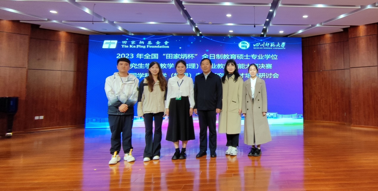2023年11月9-12日,2023年全国“田家炳杯”全日制教育硕士专业学位研究生学科教学(物理 )专业教学技能大赛决赛在四川成都举行,我校学科教学(物理)专业研究生王冰获一等奖,董悦颖获二等奖,齐若冰和赵宇轩获得三等奖,胡象岭、孟祥省两位老师获优秀指导教师奖。