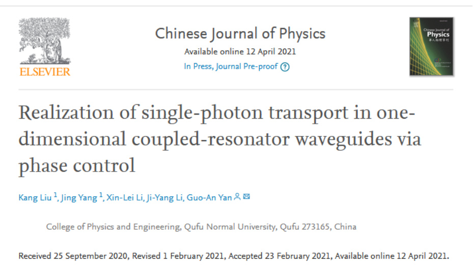2018级物理学专业刘康、杨晶、李新蕾、李霁洋的研究论文(Kang Liu#, Jing Yang#, Xin-Lei Li, Ji-Yang Li, Guo-An Yan*, Realization of single-photon transport in one-dimensional coupled-resonator waveguides via phase control,Chinese Journal of Physics(2021), DOI: //doi.org/10.1016/j.cjph.2021.02.016)。该论文以曲阜师范大学成人vr