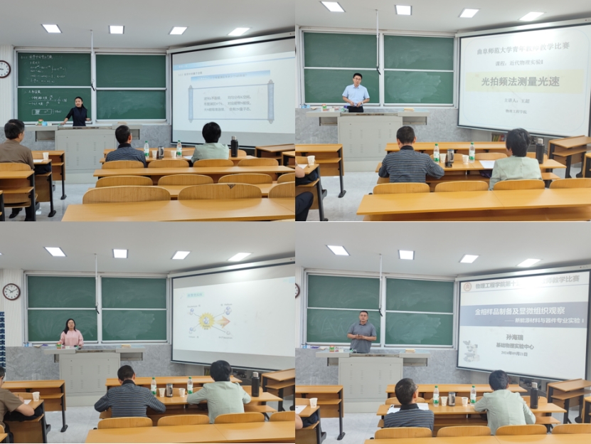 于9月18日至9月21日组织了2024年度青年教师教学比赛,比赛分预赛和复赛两个阶段进行。9月18日,各教研室内部进行了预赛,由各教研室主任和教学经验丰富的教师担任评委;9月21日,学院在物理楼二阶二教室举行了复赛,本次复赛邀请孔祥和教授、王海龙教授、杨秀芹教授、张树东教授、孟祥省高级实验师担任评委。