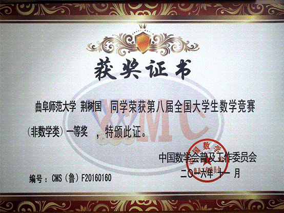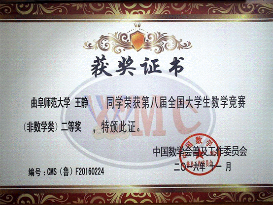第八届全国大学生数学竞赛证书
