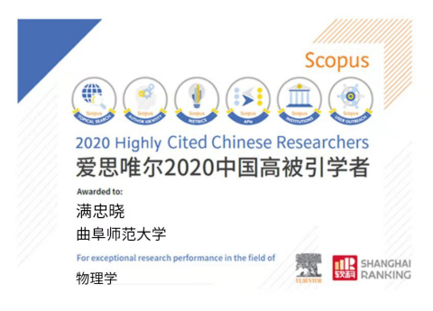 近日,学术出版业巨头爱思唯尔(Elsevier)正式发布了2020年中国高被引学者(Highly Cited Chinese Researchers)榜单,成人vr 满忠晓教授入选“物理学”学科榜单。