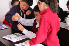 22日清晨6点,由指导老师孟祥省、韩士轩、郑萌萌、周留柱4位老师和12名学科教学(物理)专业研究生组成的科普团队从曲阜乘车出发,满载着科普道具,经过三个多小时的车程,到达莒南县坊前镇坡木村党支部大院。村里同学们早已坐满了党支部会议室,热情期待着活动开始。团队老师和研究生们有条不紊,很快完成准备工作。本次科普活动准备了15个实验,包括声、力、气、水四个单元,有演示实验、边学边做实验、体验实验和室外活动等多种形式。经过一个简单的开场,科普活动正式开始。