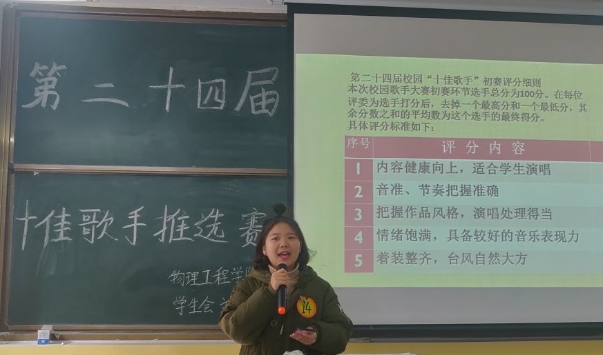 团委主办,学生会文艺部承办的第二十四届“十佳歌手”推选赛于院楼207教室举行。学生会副主席高琳然,文艺部部长陆相如、副部长朱泽雅,大学生艺术团团长王嘉豪、二十三届十佳歌手冠军杨昕祁出任评委。