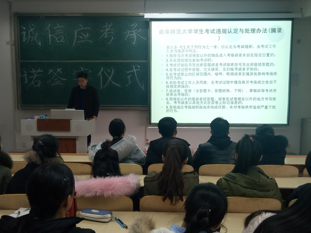 活动伊始,全体学生阅读并学习了《曲阜师范大学考试违规认定与处理办法》,明确杜绝作弊行为,遵守考试规则。随后,全体起立,由学生会主席陈相全发言并带领大家宣读诚信考试承诺书,承诺在考试中做到求真务实,服从管理,严格遵守考场纪律,以诚信积极的态度去完成此次期末考试。最后,各年级学生代表以饱满的热情有序地在诚信应考承诺书上签上自己的名字。