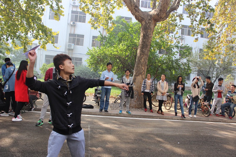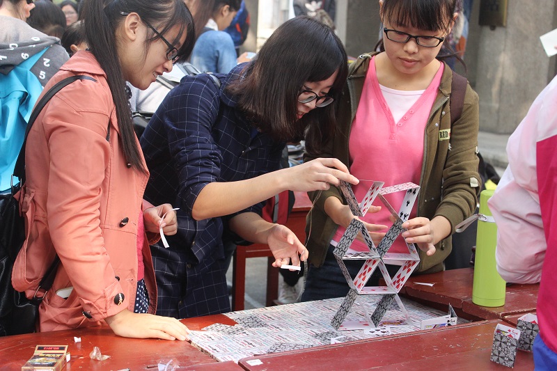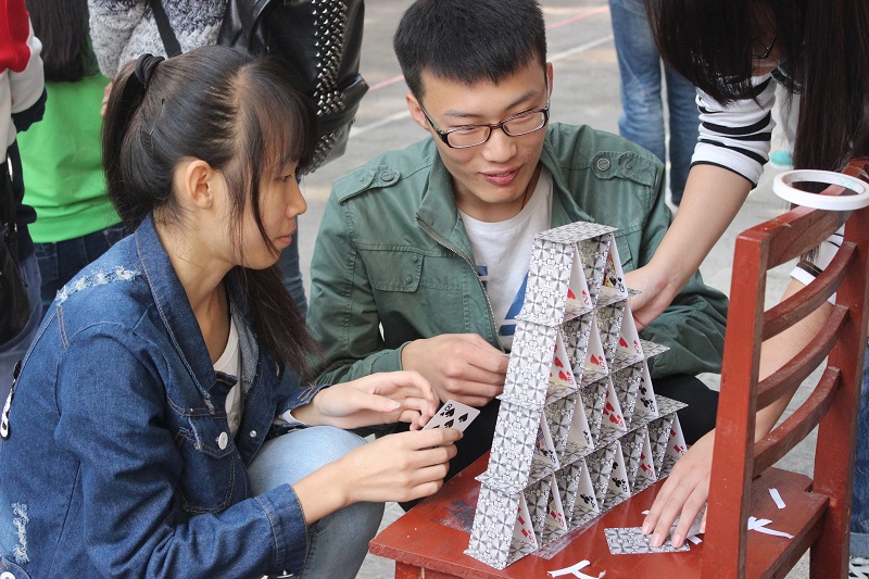 纸飞机设计比赛开始之前,工作人员讲解比赛规则。参赛同学用心设计自己的纸飞机,力求创新。并依次掷出纸飞机,工作人员以飞行距离为标准进行评定。之后,纸牌搭建大赛开始,搭纸牌的同学们努力的构思,三人分工合作、配合默契 。工作人员根据搭建物的外观、高度、稳定程度等进行测评。比赛现场气氛活跃,观众热情高涨。同学们的设计得到了一致好评。