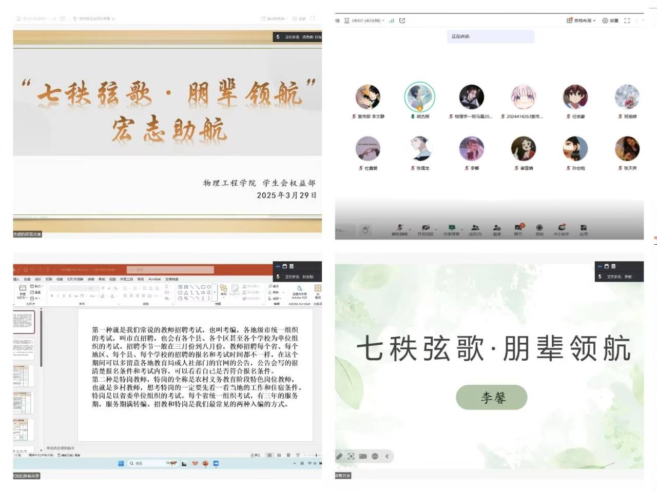 李馨详细解读教学设计步骤及重要性,分享培养注意力等实用课堂管理办法,以自身为例,提供考编途径和面试经验。孙世勉聚焦于政策解读与职业规划引导,系统梳理六种教师考编方式的政策差异,深入剖析各自特点与优势,结合当下就业形势,提出有效选择建议,介绍招聘信息获取渠道及笔试备考资料,帮助学生明确职业规划方向。