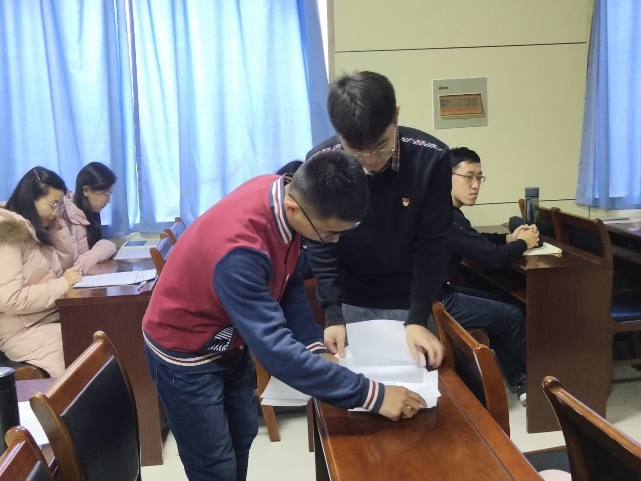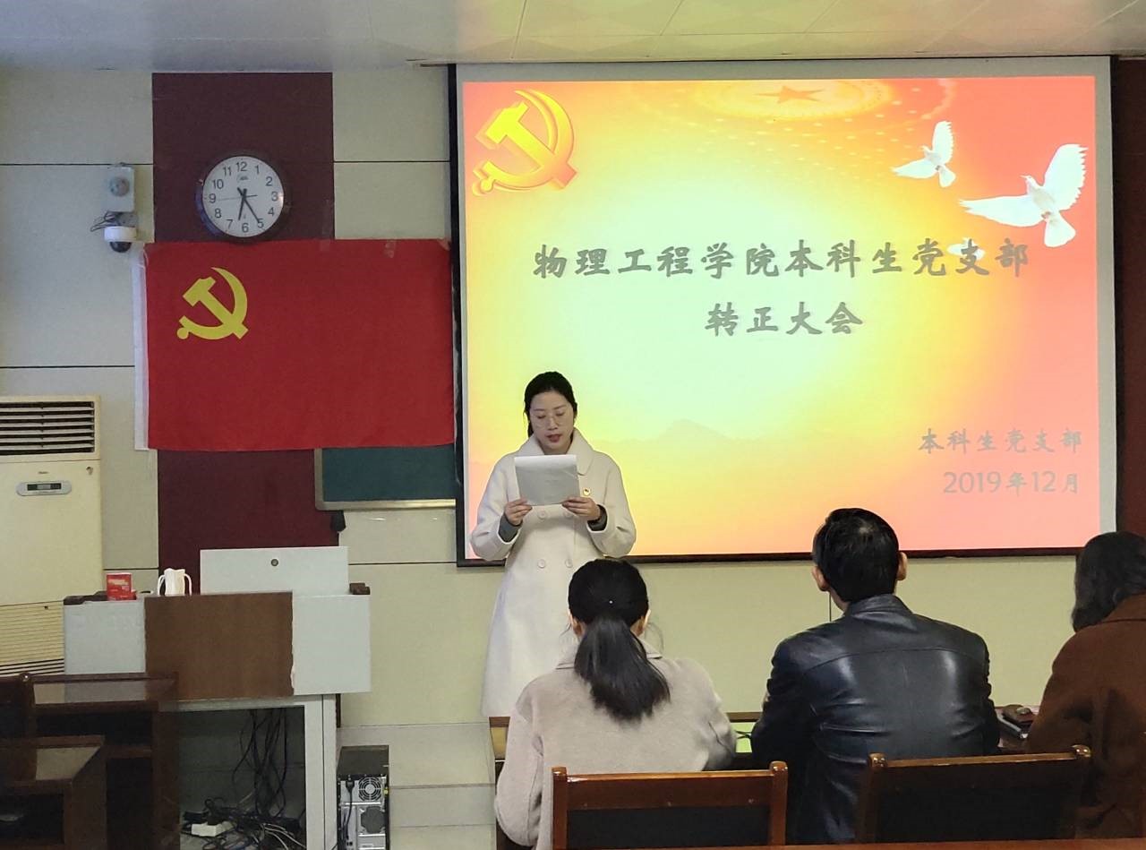 12月10日下午,学院本科生党支部在物理楼313会议室举行本科生党支部预备党员转正大会,本科生党支部书记王琼,辅导员李爱国、颜冲、李靖靖出席大会。本科生党支部全体党员参加。大会由组织委员李靖靖主持。