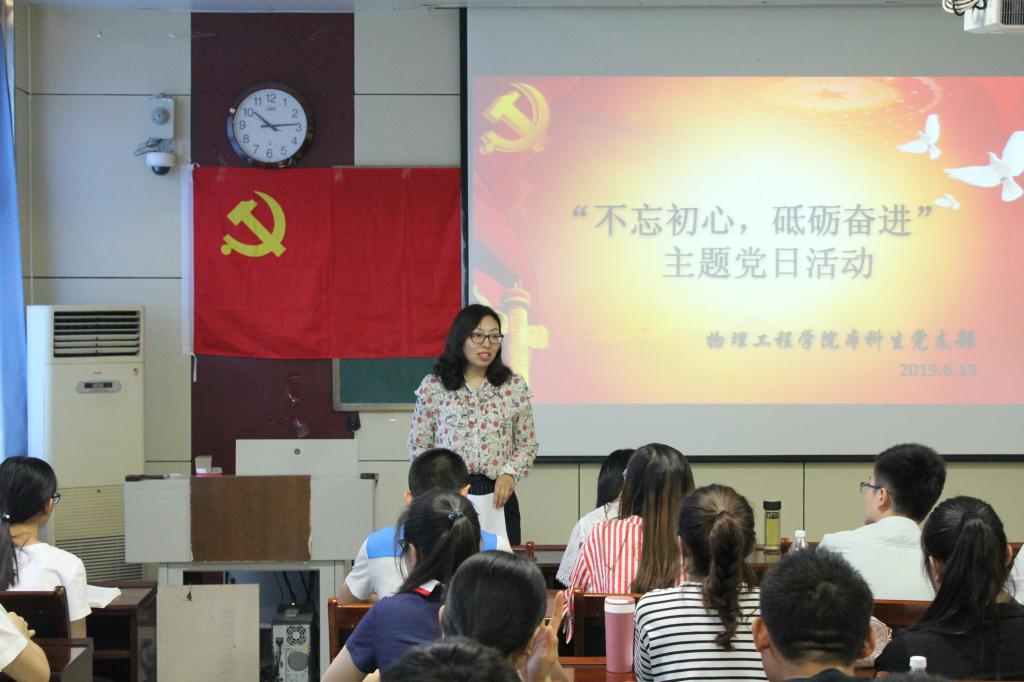 本科生党支部于院楼313会议室举行“不忘初心,砥砺奋进”主题党日活动。毕业生党员和支部其他成员参加本次活动,活动由党支部书记王琼主持。