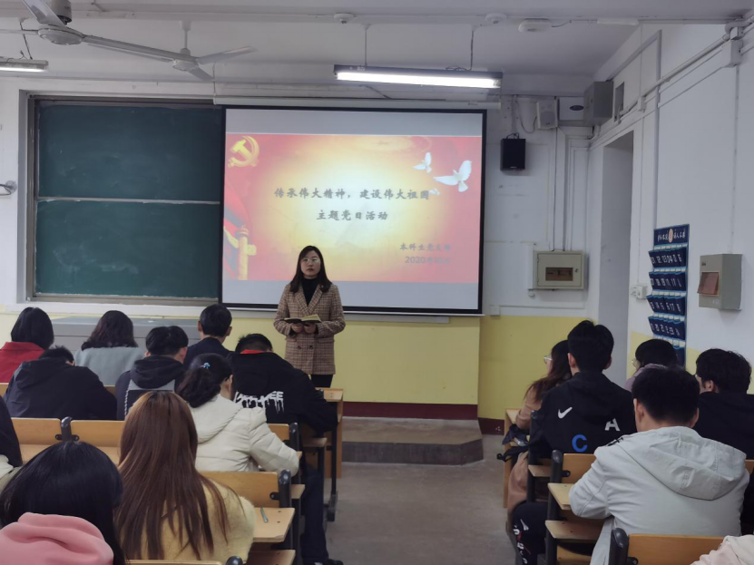 10月28日下午,学院本科生党支部于物理楼210教室开展“传承伟大精神,建设伟大祖国”主题党日活动,本科生党支部书记王琼,辅导员李爱国、颜冲、邱金芝、孔瑞、王衡出席会议,本科生党支部全体党员参加。本次活动由组织委员颜冲同志主持。