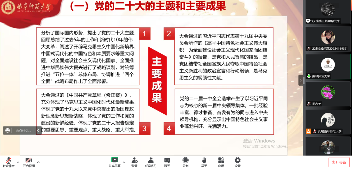 党委书记杨志英主持宣讲会,2022级辅导员孔瑞和2022级物理学(师范)2班全体学生参加。宣讲会通过线上方式进行。
