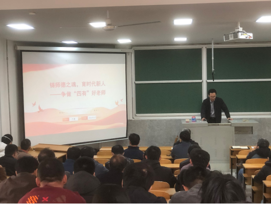 讯(通讯员:孔瑞 杨金涛 摄影:张谷天)为贯彻落实习近平总书记关于教育的重要论述,激励广大教师坚定理想信念,牢记“为党育人、为国育才”初心使命,充分发挥党建引领作用,3月19日,学院党委书记于健以”铸时代之魂,育时代新人“为题,于物理楼二阶一为全体教师讲授关于争做”四有“好老师主题党课。