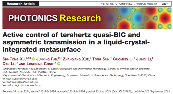连续域束缚态(BIC),是一种存在于连续辐射光谱却仍然保持局域化的电磁本征态,具有无限的光子寿命和品质因数,其在增强光-物质相互作用方面具有巨大的应用前景。然而,目前BIC或准BIC结构一般由金属或介质材料的超材料/超表面/光子晶体加工而成,其结构参数一旦确定难以实现器件的主动调控。针对此问题,课题组提出将液晶与准BIC结构结合,通过外场调控液晶取向实现器件从OFF态向ON态的主动控制。此外,基于器件前后入射的非对称响应还实现了单向传输。该研究提出的基于液晶填充的准BIC器件为太赫兹动态调控提供了有效途径,在太赫兹通信、开关和传感系统具有重要的应用价值。该工作以“Active control of terahertz quasi-BIC and asymmetric transmission in a liquid-crystal-integrated metasurface”为题发表在《Photonics Research》,许士通副教授为论文第一作者和通讯作者,南方科技大学凡俊兴助理研究员和丛龙庆副教授为共同通讯作者。
