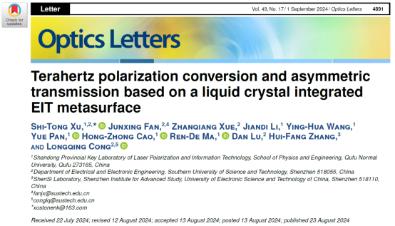 电磁诱导透明(EIT), 是一种量子相消干涉现象,其在非线性光学处理,超快开关以及光学存储等方面有着重要应用价值。课题组提出将超材料EIT器件与液晶结合,研究了一种基于液晶集成的太赫兹EIT可调器件。本研究提出的基于明暗耦合的EIT超表面具有偏振敏感性,这为通过液晶的偏振转换实现复合器件EIT的主动调控提供了新的自由度。此外,由于复合器件在前向和后向入射的偏振响应不同,该器件表现出较高隔离度的非对称传输。研究提出的液晶集成的EIT器件为设计动态可调太赫兹器件开辟了新的途径。该工作以“Terahertz polarization conversion and asymmetric transmission based on liquid crystal integrated EIT metasurface”为题发表在《Optics Letters》,许士通副教授为论文第一作者和通讯作者,南方科技大学凡俊兴助理研究员和丛龙庆副教授为共同通讯作者。
