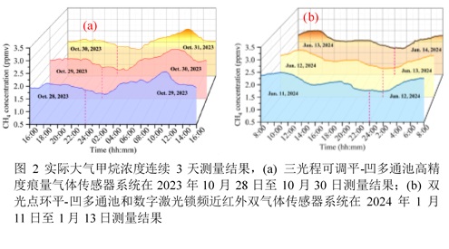 近日,牛明生老师课题组基于可调谐二极管激光吸收光谱技术(TDLAS)研究了三光程可调平-凹多通池高精度痕量气体传感器系统和双光点环平-凹多通池和数字激光锁频近红外双气体传感器系统,可用于多组分气体同时检测。其中,三光程可调平-凹多通池高精度痕量气体传感器系统在基长为0.5m的情况下实现了64.5m, 42.5m和 20.5 m的有效光程;双光点环平-凹多通池和数字激光锁频近红外双气体传感器系统,在基长为0.5m的情况下实现了129 m, 107 m, 85 m, 63 m 和40 m的有效光程。对甲烷探测的灵敏度分别达到21 ppbv(体积浓度比:1ppbv=10-9)和8 ppbv,并对校园内大气中甲烷浓度变化进行了连续72h的监测。相关成果分别发表在了中科院二区期刊Optics and Lasers in Engineering, 2024, 175, 108023和Optics Express, 2024, 32(8), 14169-14186上。本课题组研究生胡振、李桃花、李辉和本科生史永鹏做了大量工作。