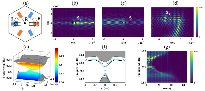 1 (a)光子晶体单元结构。(b)(c)为不同手性源激励下无能隙边界态电场强度分布。(d)电磁波沿含有60°拐角的边界传输电场分布,激励源与(b)相同。(e)体态与边界态能带色散,灰色曲面为体态,彩色为边界态。(f)有能隙边界态与拓扑角态色散,蓝色实心点为角态,黑色、蓝色、红色曲线为边界态,灰色区域为体态。(g)拓扑彩虹捕获器电场沿界面的分布。