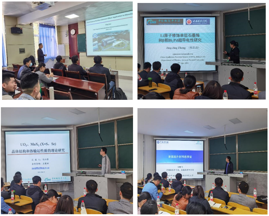 2021414-17日,应张平教授邀请,中科院合肥物质科学研究院郝宁研究员、北京理工大学郑法伟教授和中科院高能物理研究所-中国散裂中子源王保田研究员及其团队成员来我校,作了系列学术报告,并与成人vr 师生进行了深入、热烈的讨论与交流。报告会分别由付吉永教授和路洪艳教授主持。学术报告之余,各位专家听取了量子功能材料计算与设计创新团队正在开展的各项研究工作,并进行了深入的交流与指导。