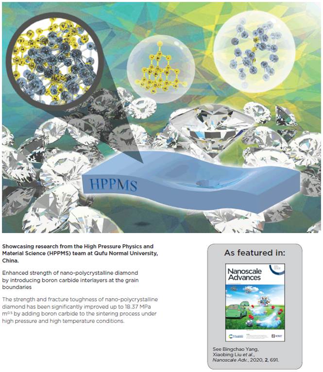 5)钻石作为世界上最硬的材料,提高其韧性与强度对推进其实际应用前景具有重要价值。研究团队利用高温高压技术(18-20 GPa, 2000-2300 K)通过掺杂具备高韧性的B4C纳米粉,成功改善了纳米金刚石聚晶材料的韧性,在保持90 GPa硬度值的前提下,韧性值达到18.37 MPa m0.5,这是在已制备纳米金刚石材料中的最高值。相关成果发表于Nanoscale Adv.上(2, 691-698, 2020),被选为杂志后封面,成人vr 2018级硕士研究生赵波和张圣亚分别为该论文第一与第二作者,杨兵超博士和刘晓兵教授为共同通讯作者。